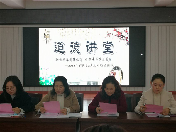為進(jìn)一步提高教師精神文明素質(zhì),按照文明辦的要求,結(jié)合我園的工作實(shí)際,大力倡導(dǎo)“愛崗、敬業(yè)、奉獻(xiàn)”基本道德規(guī)范。11月20日上午,青陽縣幼兒園2018年 “道德講堂”如期開講。
