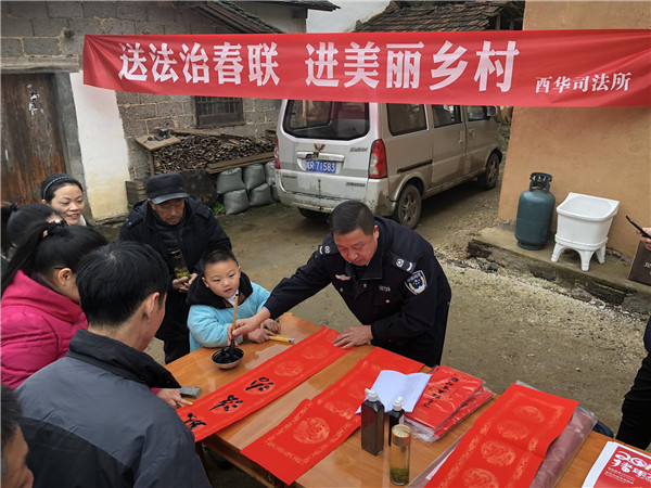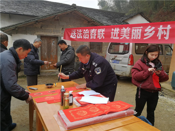 在2019年新春佳節(jié)即將來(lái)臨之際,酉華司法所施世慶于1月29日上午,跟隨酉華鎮(zhèn)黨委政府組織的“2019 年‘接您回家’暨新春‘四送’暖心活動(dòng)”走進(jìn)革命老區(qū)·美麗鄉(xiāng)村——宋沖,開(kāi)展“送法治春聯(lián)·進(jìn)美麗鄉(xiāng)村”活動(dòng)。為廣大返鄉(xiāng)農(nóng)民朋友送上了新春佳節(jié)法治文化“年貨”。在宋沖村陽(yáng)光服務(wù)站活動(dòng)現(xiàn)場(chǎng),鎮(zhèn)綜治辦、司法所調(diào)委會(huì)主任施世慶飽含熱情,擺開(kāi)書(shū)案,攤開(kāi)宣紙,揮毫潑墨,將真誠(chéng)的祝福與法治宣傳相結(jié)合,賦諸筆端。群眾紛紛趕來(lái)現(xiàn)場(chǎng)排隊(duì)領(lǐng)取,互相談?wù)撝鞲贝郝?lián)的寓意,有的根據(jù)新年心愿從準(zhǔn)備好的春聯(lián)中精心挑選,有的期望施世慶為其精心定制現(xiàn)場(chǎng)創(chuàng)作?!胺ㄖ纬娠L(fēng)國(guó)泰,道德化雨民安”等,這些對(duì)聯(lián)蘊(yùn)含著樸素的法治元素和文化理念,深受群眾喜愛(ài)。自活動(dòng)開(kāi)展以來(lái),共為創(chuàng)業(yè)返鄉(xiāng)農(nóng)民朋友書(shū)寫(xiě)法治春聯(lián)1000余幅,將法治文化融于春聯(lián)當(dāng)中,貼近了群眾的生活,營(yíng)造出一種“抬頭就見(jiàn)法,進(jìn)門(mén)先學(xué)法,過(guò)節(jié)不忘法”的良好氛圍,收到了良好的社會(huì)效果。