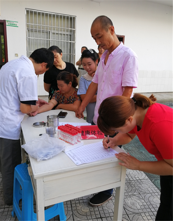 講座結(jié)束后,在志愿者的協(xié)助下,王長春和將軍村村醫(yī)為健康家庭成員進(jìn)行體檢,包括抽血、心電圖、尿檢等項(xiàng)目。