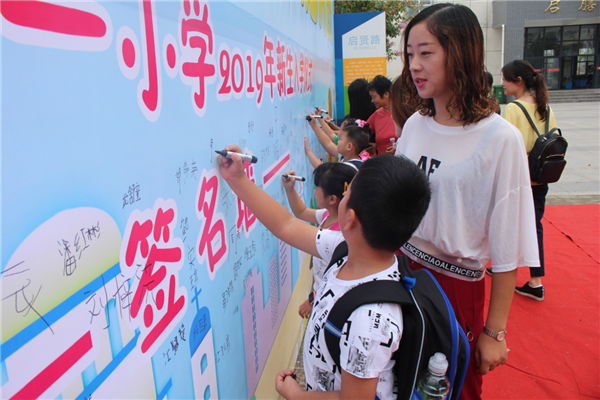 走到簽名墻,一個個孩子用他們稚嫩的小手鄭重地寫下自己的名字。他們將在這里渡過六年的小學(xué)生涯,為自己美麗的將來播下幸福的種子,奠定堅實的基礎(chǔ)。
