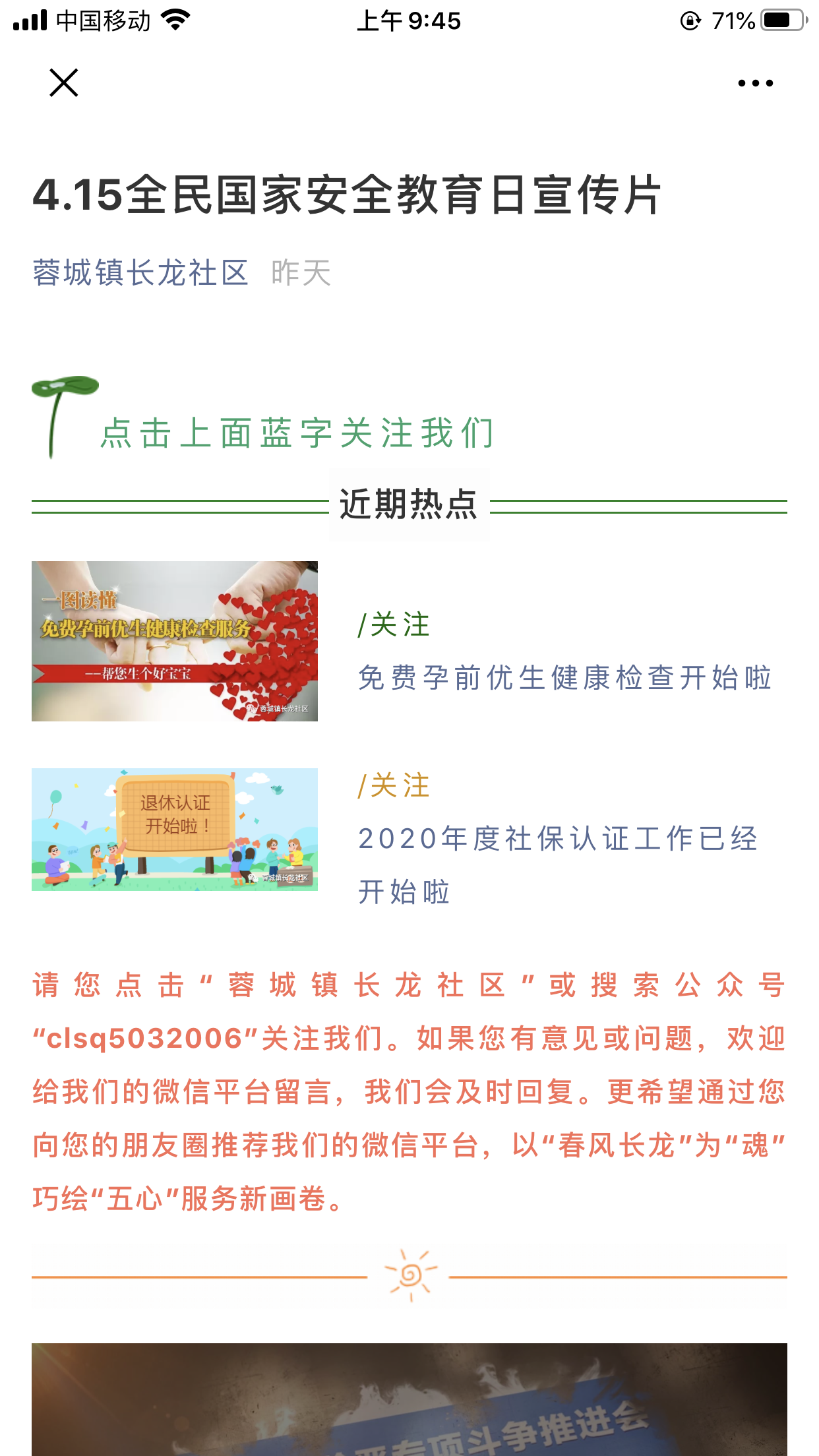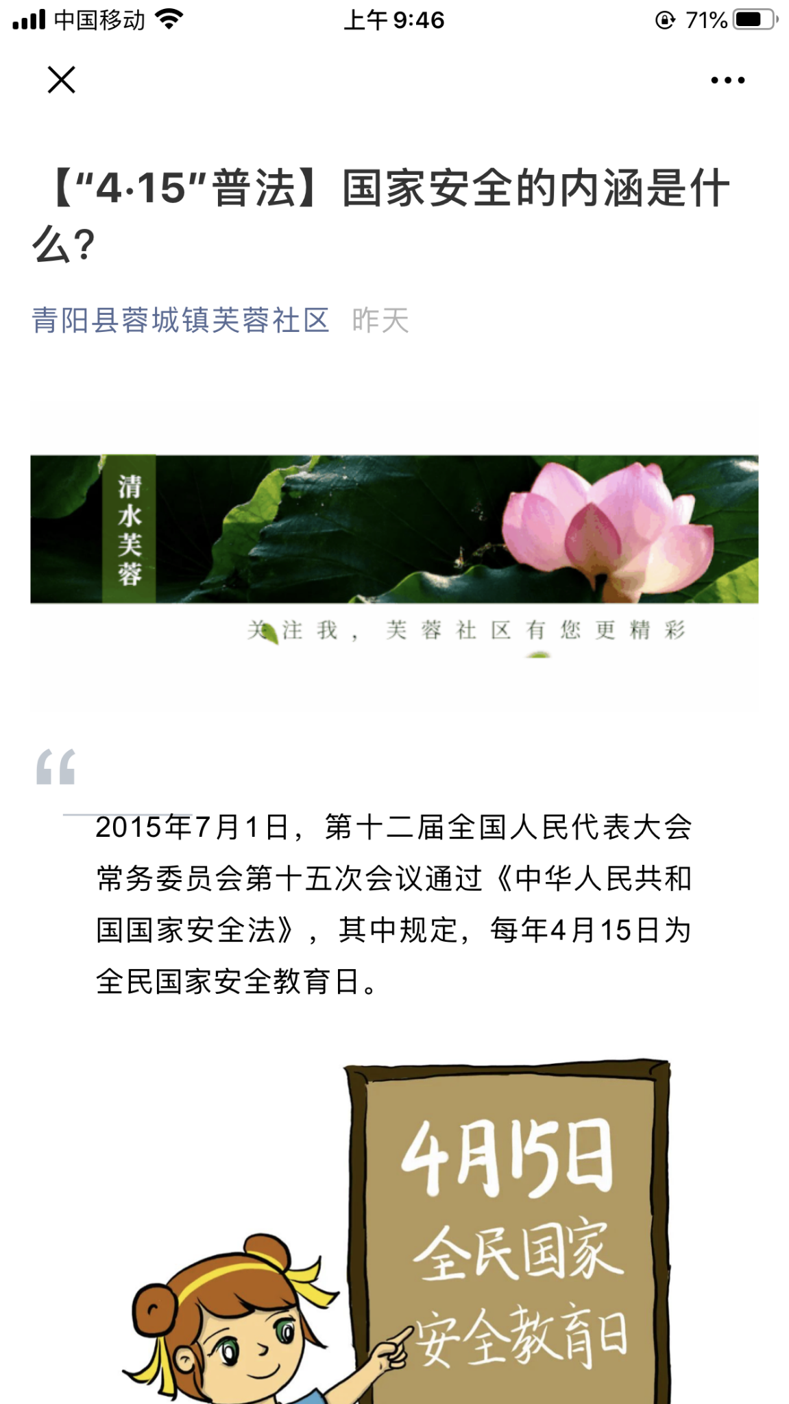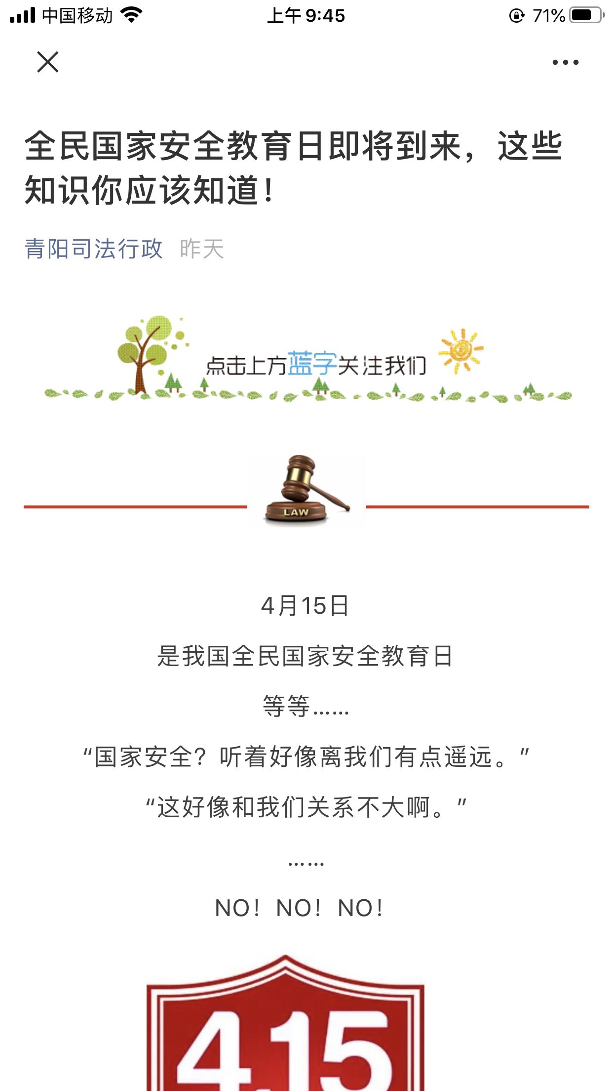 一部曲線上延伸,擴(kuò)大宣傳面。各鄉(xiāng)鎮(zhèn)、縣直各單位微信公眾號(hào)、微博及青陽(yáng)網(wǎng)等多媒體同步推送轉(zhuǎn)發(fā)國(guó)家安全法、反間諜法、網(wǎng)絡(luò)安全法的專題頁(yè)面、短視頻、圖解、動(dòng)漫等內(nèi)容,廣泛宣傳普及國(guó)家安全知識(shí)。各單位顯示屏滾動(dòng)播放國(guó)家安全宣傳片;縣城及鄉(xiāng)鎮(zhèn)村法治文化陣地張貼國(guó)家安全法律法規(guī)、宣傳畫(huà)等。讓老百姓深刻認(rèn)識(shí)到維護(hù)國(guó)家安全人人有責(zé),從而營(yíng)造全社會(huì)維護(hù)國(guó)家安全的良好氛圍。推送轉(zhuǎn)發(fā)信息 500余條,張貼宣傳畫(huà)120幅。