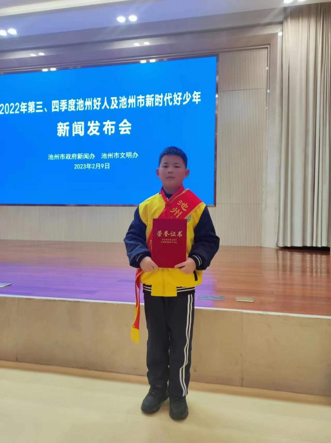 2023年2月9日,池州市政府新聞辦、池州市文明辦舉辦2022年第三、四季度池州好人及池州市新時代好少年新聞發(fā)布會。其中青陽縣廟前鎮(zhèn)中心小學(xué)王俊煒同學(xué)榮獲池州市第四季度“新時代好少年”稱號。